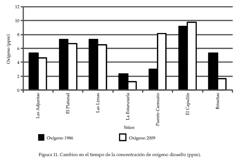 En cuanto a las variables ambientales, los valores de oxígeno disuelto fueron relativamente bajos a lo largo de todo el río (cuadro 3). El pH resultó tendiente a la acidez, aunque con cantidades muy aproximadas al valor neutro. Los valores de la conductividad eléctrica aumentaron de manera gradual, conforme se dirige de la parte alta a la parte baja de la cuenca.