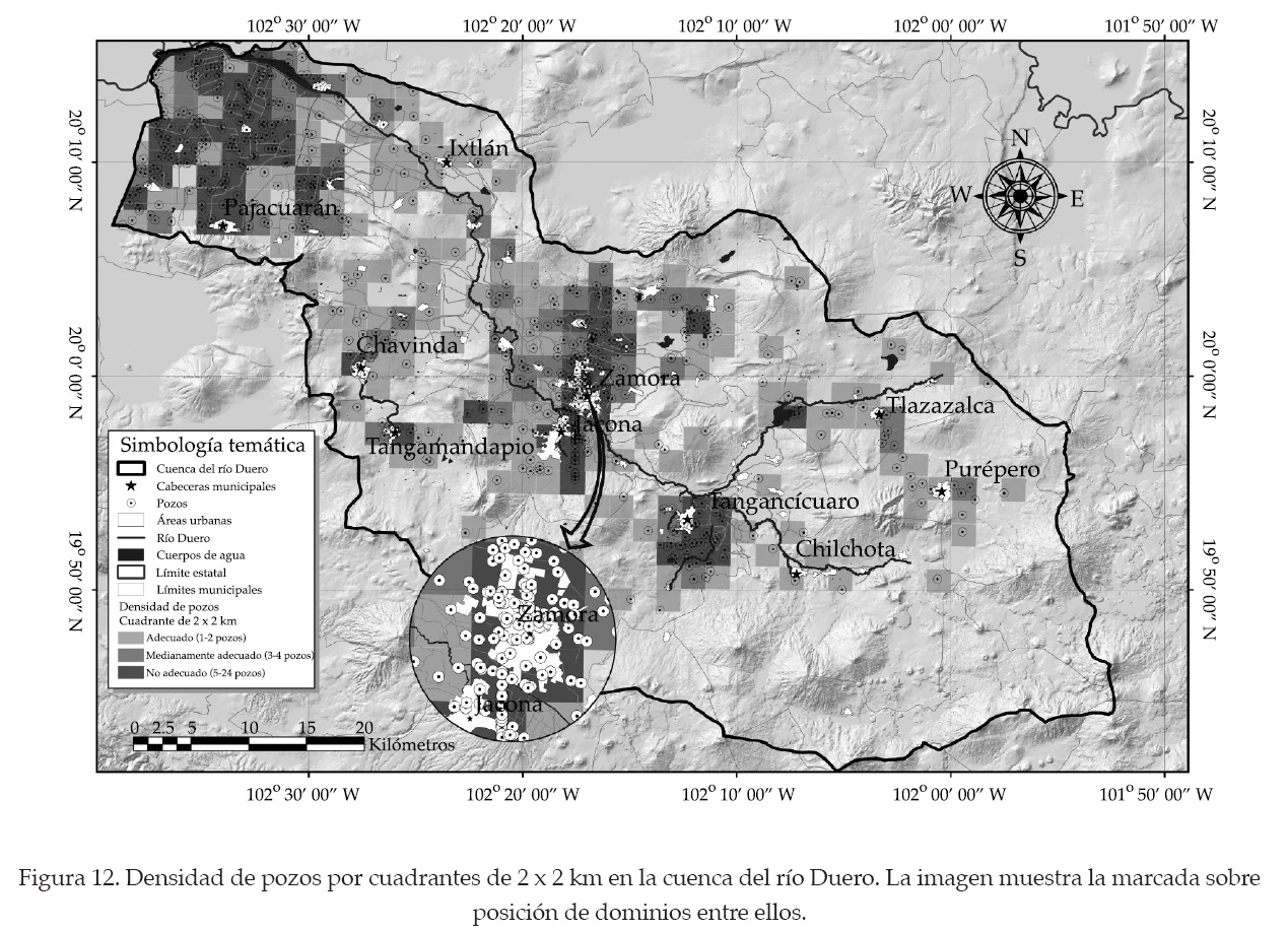 La problemática sentida en la calidad del agua superficial fue el detonador de la apertura de una gran cantidad de pozos profundos para explotar el agua subterránea, pasando de un registro de 150 aprovechamientos para el año 2000 a 805 en la actualidad (REPDA-Conagua). La apertura de estas concesiones se ha realizado sin planeación alguna, como lo demuestra la alta concentración de pozos, pudiéndose encontrar hasta 20 pozos por áreas de 4 km2. La figura 12 muestra esta problemática, definiéndose tres niveles: baja (0-2), moderada (3-4) y alta (> 4); como consecuencia, se inicia un círculo vicioso de perforación de pozos que puede propiciar su agotamiento.