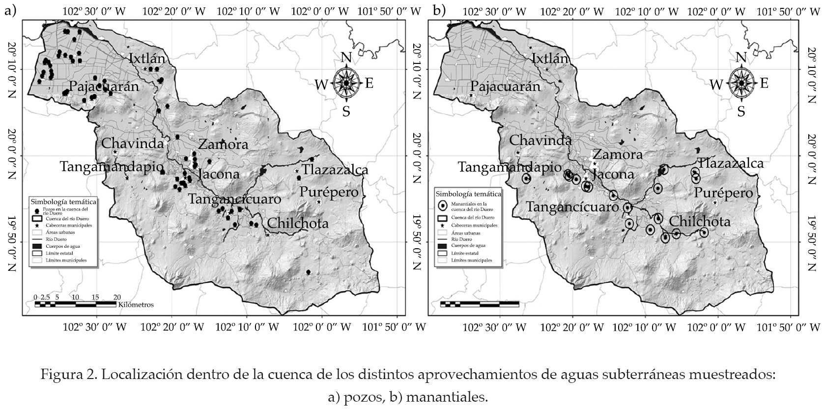 La figura 2 muestra la localización dentro de la cuenca de los 76 pozos y 20 manantiales muestreados.