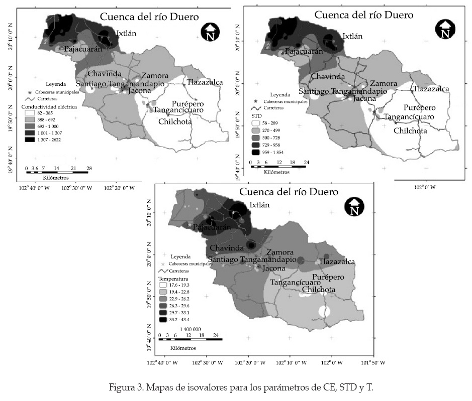 Para tener una idea preliminar de la calidad química del agua para uso agrícola se obtuvieron mapas de isovalores para los parámetros de conductividad eléctrica (CE), sólidos totales disueltos (STD) y temperatura (T). La figura 3 muestra la configuración de los mismos en la cuenca.