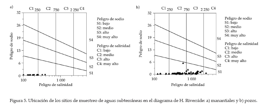 En la región lacustre se encontraron aguas del tipo C3-S1, con peligrosidad alta a la salinización, por lo cual su uso debe restringirse al riego de productos tolerantes a dicha condición. Finalmente, el ambiente lacustre influenciado por hidrotermalismo, la clase de agua predominante, es C3-S3, con salinidad muy alta y peligro de sodio alto, por lo que su uso en la agricultura se debe restringir.