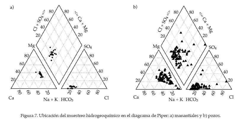 En relación con la clase de agua presente, la figura 5 muestra la ubicación de manantiales y pozos, respectivamente, en el diagrama referido.
