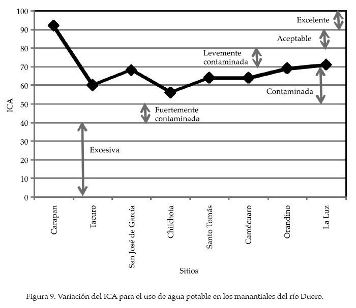 La interpretación de los valores ICA en los ocho manantiales analizados, en términos de su uso en la categoría de agua potable, indica que sólo el manantial de Carapan (origen del río Duero) muestra condiciones de excelente calidad (92 puntos; figura 9). La localidad del manantial de La Luz presenta contaminación leve. El resto de los manantiales, como es el caso de Camécuaro, Orandino y San José de Gracia, se clasifican como contaminados, destacando en particular la presencia de bacterias coliformes fecales.