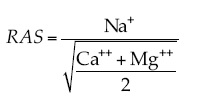 Para definir el peligro de salinización o sodificación del suelo a partir de parámetros medidos en el agua de riego, se utilizó el esquema propuesto por el U.S. Soild Salinity Laboratory Staff, en 1954, conocido como Normas de Riverside. Este sistema se basa en la medida de la conductividad eléctrica del agua para determinar el riesgo de salinización del suelo y en el cálculo de la Relación de Adsorción de Sodio (RAS), para definir el riesgo de sodificación o alcalinización, mediante la fórmula: