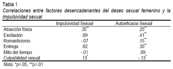 Para identificar las relaciones entre los factores de la escala de deseo sexual y los factores de la escala de impulsividad sexual se efectuaron correlaciones producto-momento de Pearson. Los coeficientes indicaron que el factor de autoeficacia sexual está relacionado con prácticamente todos los factores del deseo sexual femenino. Se observó una correlación positiva entre el factor atracción física y ambos factores de la escala de impulsividad sexual, es decir cuando una mujer experimenta deseo sexual ante un estímulo atractivo para ella -persona, material de contenido erótico, etc.-, se incrementa tanto su impulso sexual -factor impulsividad-, como su seguridad y confianza sexual -factor autoeficacia sexual- ante sus conductas sexuales.