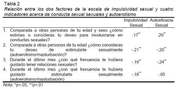 Además se obtuvieron las correlaciones entre los dos factores de la escala de impulsividad sexual y los indicadores de conducta sexual y autoerotismo. Las correlaciones producto momento de Pearson que resultaron significativas fueron positivas entre los dos factores de impulsividad sexual, indicando que entre más alto es el deseo de las mujeres por involucrarse en conductas sexuales mayor serán sus niveles tanto de impulsividad sexual como de una sensación de autoeficacia sexual. De manera opuesta se encontraron relaciones negativas entre la impulsividad y autoeficacia sexual, el deseo de autoerotismo en comparación con otras mujeres y las ganas de tener sexo en el último mes (ver Tabla 2).