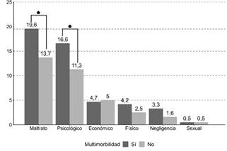 En la figura 1 se puede observar que la prevalencia de maltrato general es mayor cuando existe la presencia de multimorbilidad (19,6% frente a 13,7%, p<0,05). Específicamente, el tipo de maltrato que mostró diferencias estadísticamente significativas fue el psicológico (16.6% frente a 11.3%, p<0,05).