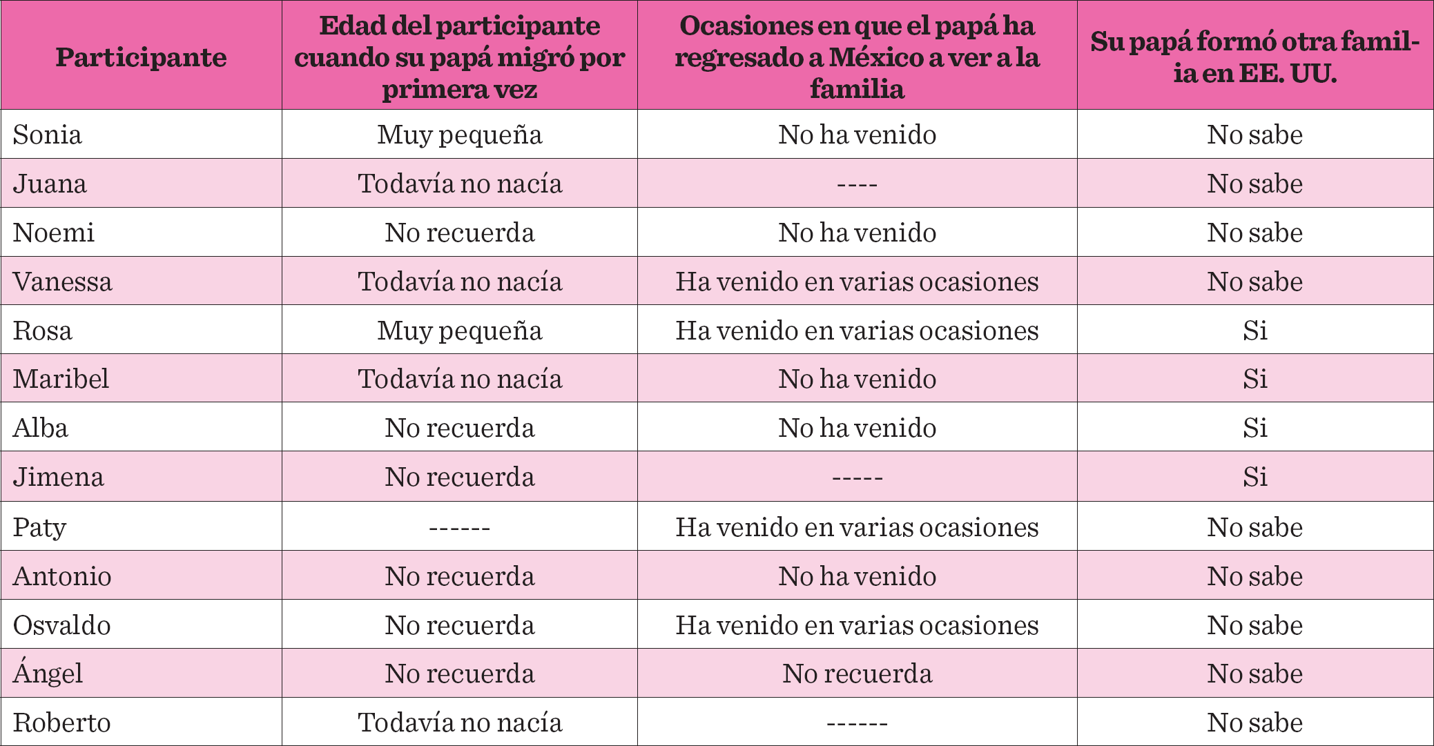 La mayoría de las y los jóvenes participantes compartían la experiencia de que su papá migró cuando ellos eran pequeños (Tabla 1); por ejemplo, algunos conocieron a su papá cuando tenían 5 años de edad o más. Muchos dicen: "desde que tengo razón, mi papá no ha estado". Indicando que el abandono que las y los jóvenes experimentan, viene de tiempo atrás. Lo cual encaja con las definiciones que ubican al abandono como una forma de violencia, donde existe omisión de los cuidados hacia los niños pequeños, quienes se encuentran en una posición de mayor vulnerabilidad (López y Obregón-Velasco, 2014).