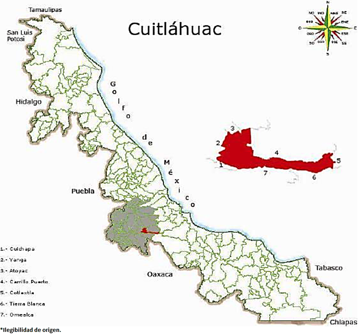 El municipio de Cuitláhuac se ubica en la región de las Altas Montañas en el estado de Veracruz entre los paralelos 18°42’ y 18°51’ de latitud norte y los meridianos 96°28’ y 96°47’ de longitud oeste, a una altitud entre 140 y 500 m (Figura 1), con una extensión territorial de 150.2 km2 y 26,265 habitantes. El municipio se compone por 74 localidades, de las que solo la cabecera municipal se considera urbana (Sefiplan, 2019).
