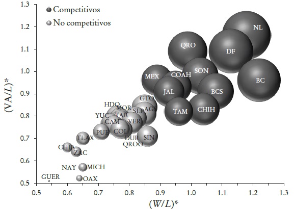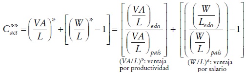 En este trabajo profundizamos en la versión de competitividad de las actividades y las entidades por referencia a las características de tipo económico antes señaladas (y no las organizacionales o institucionales usuales en otros ejercicios).11 Nuestra estimación consiste en integrar dos elementos fundamentales de la competitividad económica: la productividad laboral relativa a la del país (ventaja revelada de productividad), y el nivel salarial relativo que asociamos como indicador del empleo de mano de obra con mejor calificación (ventaja revelada salarial). En una revisión comparativa de los índices de competitividad (Garduño et al., 2013), nuestra medición ha sido considerada de mayor mérito por sus atributos de poder explicativo con pocas variables.12
