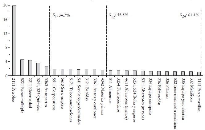 La relevancia individual de algunas actividades es muy significativa sobre la mayoría restante. Las cinco más importantes suman 34.7% del total nacional, muy destacadamente la extracción de petróleo con 19.9% por sí misma. Las otras cuatro por encima del 2% nacional son: banca múltiple, energía eléctrica, industria química y autopartes (Gráfica 1). El listado puede extenderse a otras siete actividades con más de 1.5% cada una, a saber: corporativos, servicios de empleo, operadores de telecomunicaciones, servicios profesionales, bebidas, fabricación de autos y comercio de materias primas, elevando el acumulado a 46.8%. Otras doce actividades por encima de 1% incluyen: industria alimentaria, farmacéuticos, abarrotes (menudeo y mayoreo), casas de bolsa, equipos de cómputo, edificación, plásticos, instituciones financieras, equipo de energía eléctrica, productos metálicos y pan y tortillas. En suma, las 24 actividades antes listadas dan cuenta de más del 60% (61.4%) del valor agregado nacional (Gráfica 1). Esto deja un saldo de cuantiosas actividades (58) de poco peso individual y que suman 38.6% del valor agregado del país.