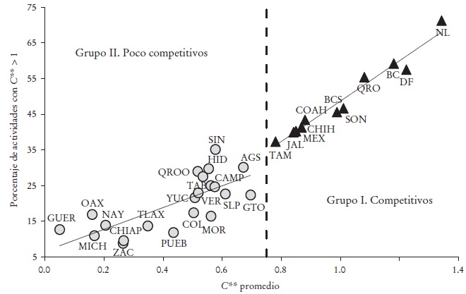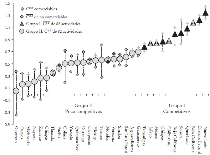 En el mismo sentido, los 11 estados del grupo competitivo y productivo tienden a menor especialización por sus estructuras más diversificadas, balanceadas y en algunos casos muy internacionalizadas. Su competitividad privilegia a las actividades comerciables entre las más competitivas, tanto en la proporción que significan de las actividades competitivas, como en el valor agregado que representan. Las entidades más maduras de este grupo como Nuevo León, el D. F., Querétaro, el Estado de México y Jalisco quedan muy claramente en gran diversificación competitiva y muy por debajo de la media nacional en especialización. Aunque con índices todavía un poco más altos, también forman parte de este grupo los estados de la frontera norte, en los que se observa una mezcla peculiar de sectores tradicionales y otros de reciente arraigo, comúnmente bajo la influencia de una o dos grandes empresas multinacionales. Es de suponer que estas entidades competitivas disfrutan de estructuras productivas más uniformes y con ganancias de productividad y altos salarios que se transmiten entre las actividades de sus entornos cercanos, creando ambientes más “modernos” en provecho de todos.