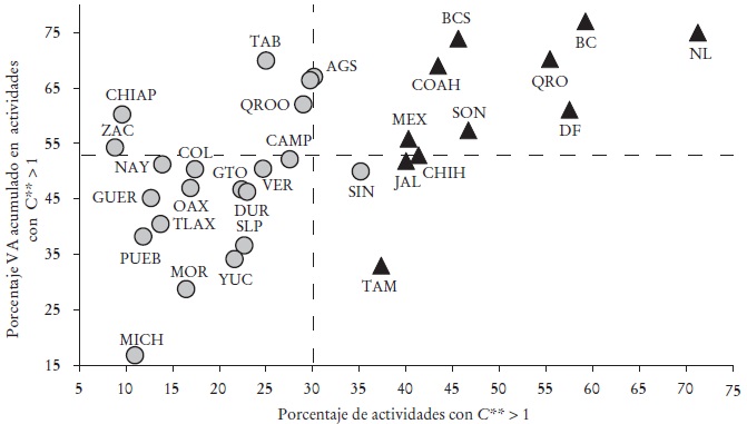 Las proporciones de actividades competitivas son muy consistentes con el nivel de competitividad promedio pues entre los competitivos, aún el nivel del D. F. que es superado por BC está en la línea de tendencia (Gráfica 4). Entre los estados poco competitivos, la pendiente de tendencia es un poco menor y comprende también muchas más excepciones en los dos sentidos. Ahora bien, exploremos en seguida qué puede decirse de la concentración de actividad de los estados (%VA acumulado) y su relación con las condiciones competitivas.