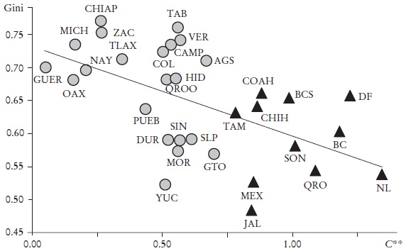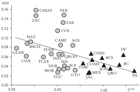 Las medidas absolutas de diversificación (lo opuesto a concentración) de la actividad económica de cada estado guardan relación con el índice de competitividad, tal como se postuló al inicio de esta sección. La correlación entre los estimados de competitividad de los estados con el índice HHI,23 se corresponden en sentido negativo, al más alto nivel de significancia (Cuadro 5). El mismo resultado vale para la competitividad aproximada como porcentaje de actividades con índice C** > 1.0. Y también aplica el mismo resultado para la relación entre competitividad y el índice de Gini24 en sentido negativo, resultados que indican un mejor desempeño competitivo para los estados con una estructura productiva más diversificada y balanceada.