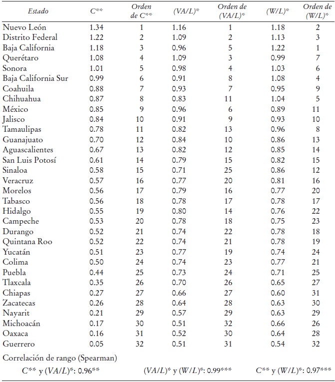 Las estimaciones a partir de las medias de C**, VA/L* y W/L* por cada estado dan resultados comparativos robustos y bastante consistentes, como puede verse en el ordenamiento del Cuadro 1. El orden de los estados ya sea por el valor de C** o alternativamente entre (VA/L* y W/L* cada uno de los dos componentes por separado) conduce a resultados de muy alta correlación, como puede verse al final de ese cuadro. Los pocos cambios de orden se deben principalmente al efecto de los salarios, dado el mayor nivel de éstos en los estados de la frontera norte. No obstante, el ordenamiento por competitividad sigue siendo el más representativo de las tendencias en conjunto.15