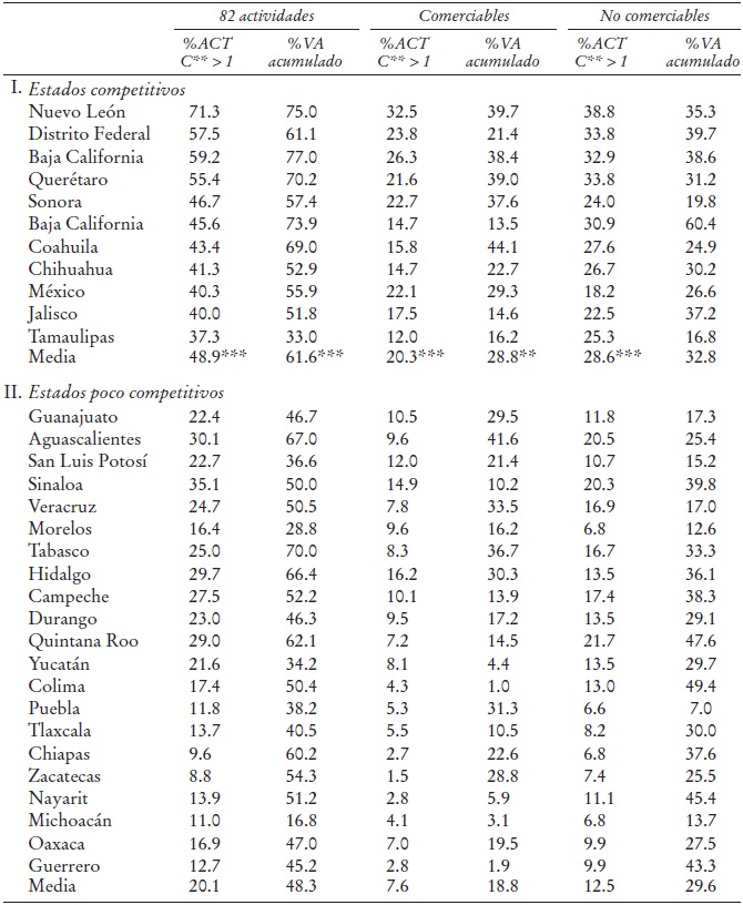 En el mismo sentido, la proporción de actividades relativamente competitivas (C** > 1) se corresponde con la competitividad media de los estados. El Cuadro 3 arroja resultados de muy alta significancia en la comparación entre estados competitivos y poco competitivos: los competitivos tienen casi la mitad de sus actividades en condiciones de alta competitividad y éstas representan cerca de dos terceras partes del VA (61.6%). Entre los más destacados, las proporciones son aún mayores: Nuevo León (casi tres cuartas partes de las actividades y del VA son altamente competitivos), Baja California (59.2% y 77.0%), Querétaro (55.4% y 70.2%), el D. F. (57.5% y 61.1%), entre otros. Para los estados no competitivos las proporciones se reducen a 20.1% y 48.3% respectivamente, diferencias significativamente menores al otro grupo. Al diferenciar entre comerciables y no comerciables, la significancia se mantiene a favor de los estados competitivos, y en particular para los comerciables tanto en proporción de actividades competitivas como en el valor agregado que representan.