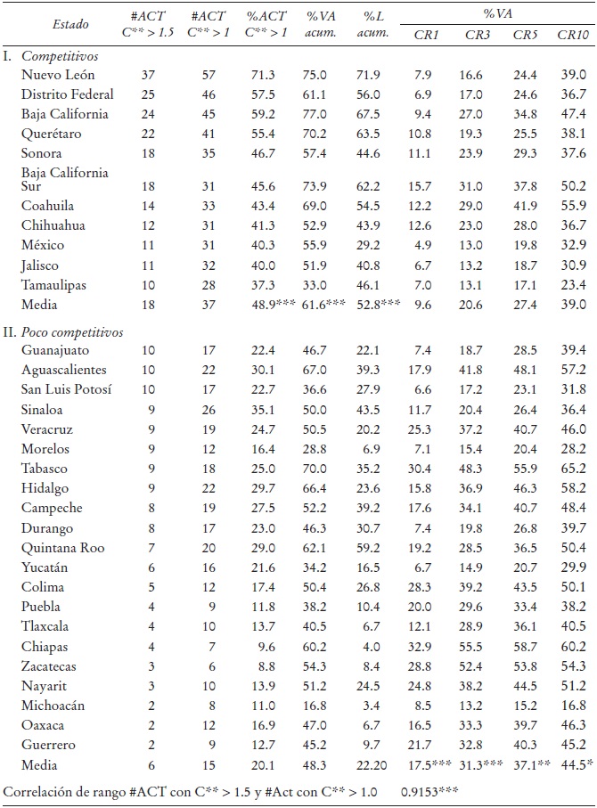Otra evidencia de mejor situación de competitividad compartida al interior de los estados competitivos se obtiene del mismo Cuadro 4, en tanto que la participación media de las pocas actividades más importantes (CR1 a CR10) destaca menos en estos estados que en los poco competitivos. En otras palabras, en los primeros se da una situación competitiva más diversificada y compartida, mientras que en los segundos son pocas pero más importantes individualmente las actividades que responden con condiciones competitivas. Es cuestión de reparar en que la principal actividad (indicada por el CR1) en los estados de Chiapas, Tabasco, Colima y Zacatecas ronda por 30% del VA estatal.22 En cambio, las entidades como Estado de México, Jalisco, Tamaulipas, Nuevo León y el D. F. no sobrepasan de 13-17% del VA en las tres actividades competitivas principales (CR3).