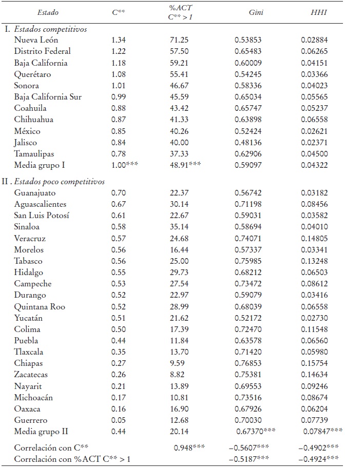 En el Cuadro 2 se muestran las diferencias significativas entre los dos grupos de estados en los tres indicadores de referencia. La media de competitividad (C**) es 1.00 para los estados competitivos en tanto que la de los poco competitivos promedia 0.44. Similarmente, la productividad respectiva es 0.97 y 0.71. También los salarios son muy diferentes: medias de 1.04 y 0.73, respectivamente. En todos los casos, la prueba de diferencias alcanza la mayor significancia estadística.
