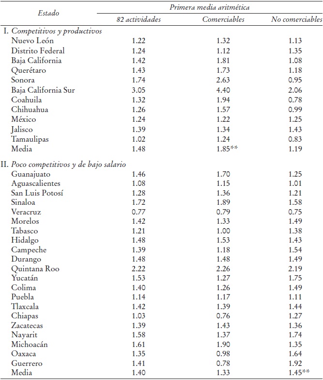 Por último, una estimación complementaria puede obtenerse de los grados de especialización relativos. Esto es, se espera que las estructuras diversificadas también muestren tendencias a especializarse en lo que son más competitivas, así sea en términos relativos; también se anticipa que la diversificación con especialización será más frecuente e importante entre las actividades comerciables. La estimación se hace con los índices de especialización revelada (IER) según se definen usualmente.27 Un primer acercamiento para los dos grupos de entidades confirma las expectativas con resultados interesantes al distinguir entre actividades comerciables y no comerciables: las actividades comerciables alcanzan una especialización significativamente mayor entre los estados competitivos (IER: 1.85* > 1.33). Por el contrario, las actividades no comerciables ocupan una mayor significancia para los estados poco competitivos (IER: 1.45** > 1.19), como es también de esperarse.