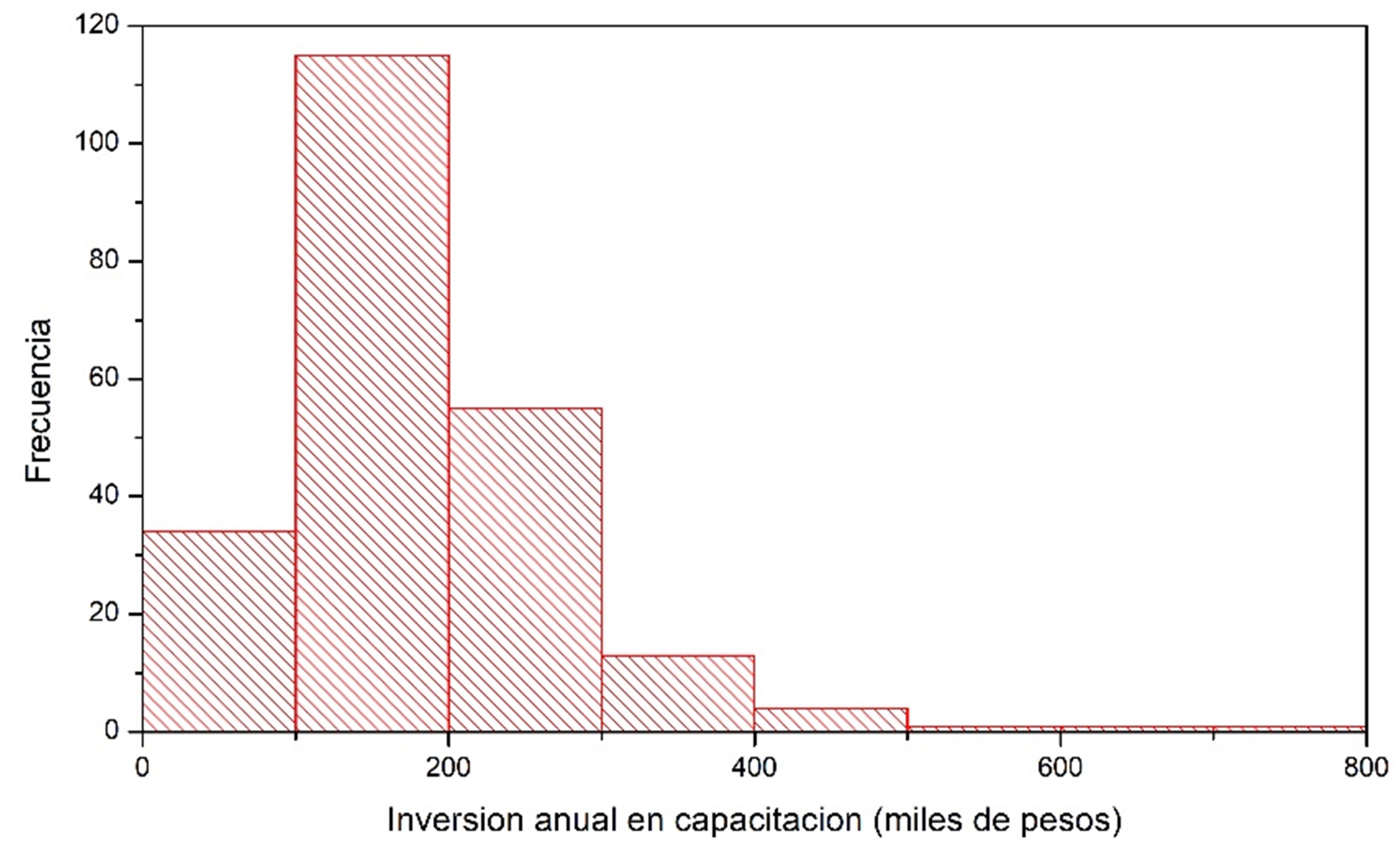 En la Figura 1, se muestra la distribución de frecuencias de las 203 muestras que reportaron invertir en capacitación, se aprecia que la mayoría reportó una inversión cercana a los $185,290 pesos anuales, y pocos establecimientos (15 %) una inversión mayor a $265 mil (+1 DS), condición que se confirma con el sesgo positivo y significativo (sesgo = 1.22) encontrado.