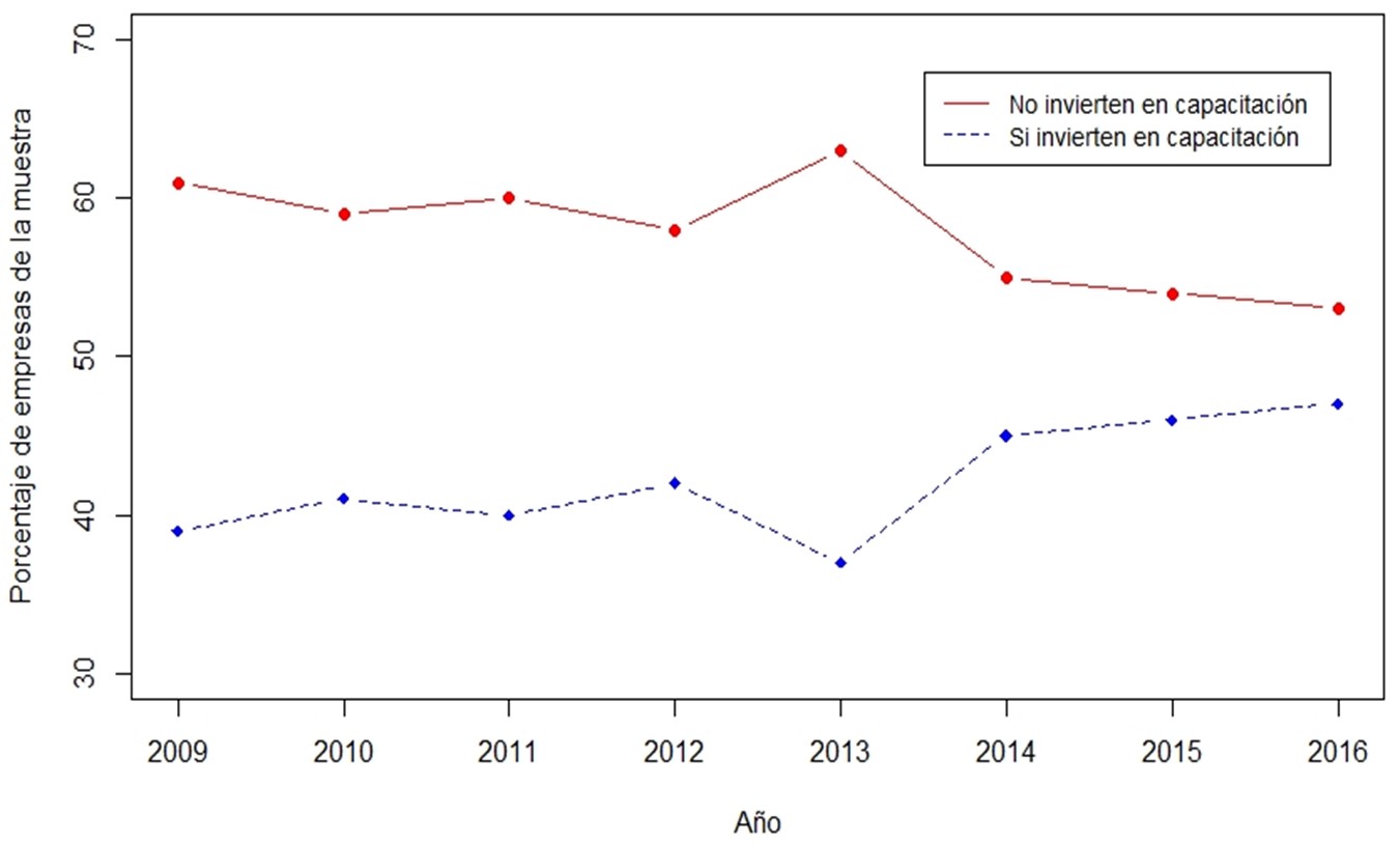 A pesar de que el número de empresas que reportaron invertir en capacitación fue menor al 50 %, al realizar un análisis de tendencia de largo plazo en el periodo estudiado de 8 años, se identificó un incremento anual de 1.1 % (el intervalo al confianza al 95% va entre 0.1% a 2.1%), esto es, en el año 2009, el porcentaje de empresas de la industria manufacturera que invirtió en capacitación era del 39.1 %, mientras que para el año 2016 del 46.6 %. En la Figura 2 se muestra gráficamente el comportamiento mencionado, apreciándose la tendencia creciente para los establecimientos que invierten en capacitación y decreciente para aquellas que no.