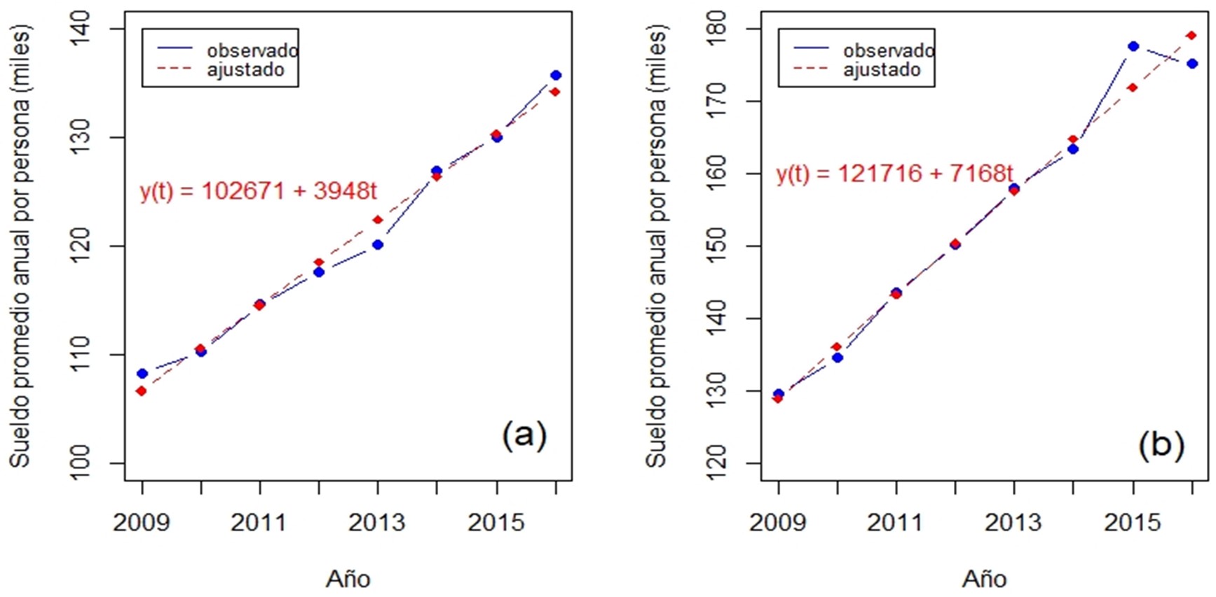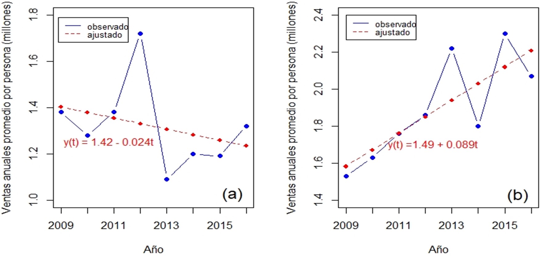 Por otra parte, en las ventas anuales por persona, se observa una tendencia decreciente para los establecimientos que reportaron no haber invertido en capacitación (MAPE=9.19, MAD=1.24e05), mientras que el comportamiento es creciente para aquellos que decidieron invertir en su capital humano (MAPE=5.80, MAD=1.16e05). A diferencia de los sueldos, como se aprecia en los estadísticos, el ajuste de la recta para la tendencia creciente y decreciente tiene un error porcentual absoluto medio de 5.8 y 9.2 respectivamente, que, si bien no es alto, es un valor a considerar para generación de pronósticos.