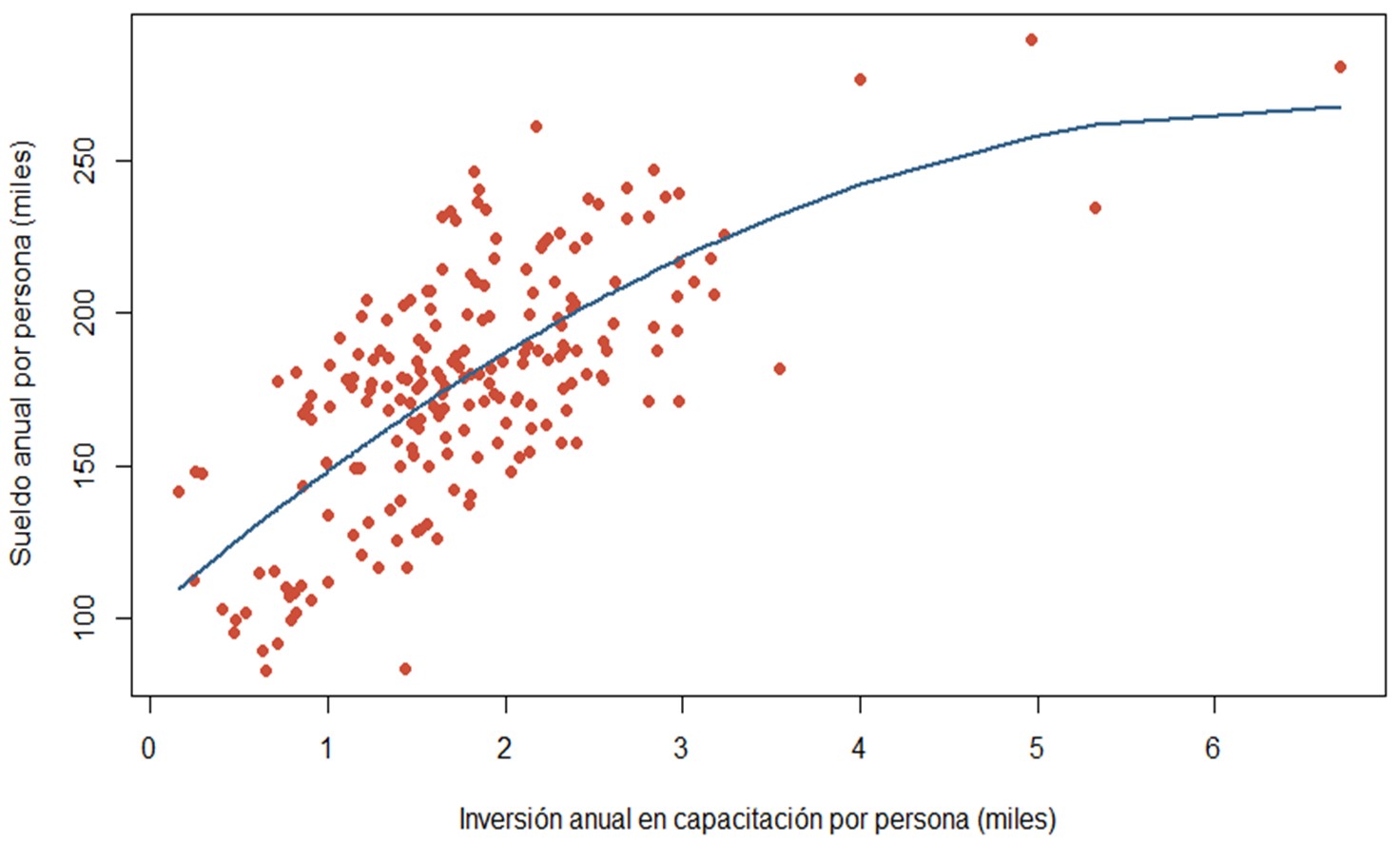 En la Figura 5, se muestra el comportamiento de los sueldos anuales promedio por persona en función a la inversión anual promedio en capacitación. El análisis de regresión mostró que el 48.3 % de la variabilidad de los sueldos por persona es explicado estadísticamente por la inversión en capacitación (F=93.43, p(2e-16)<0.05), la ecuación que modela dicho comportamiento es: