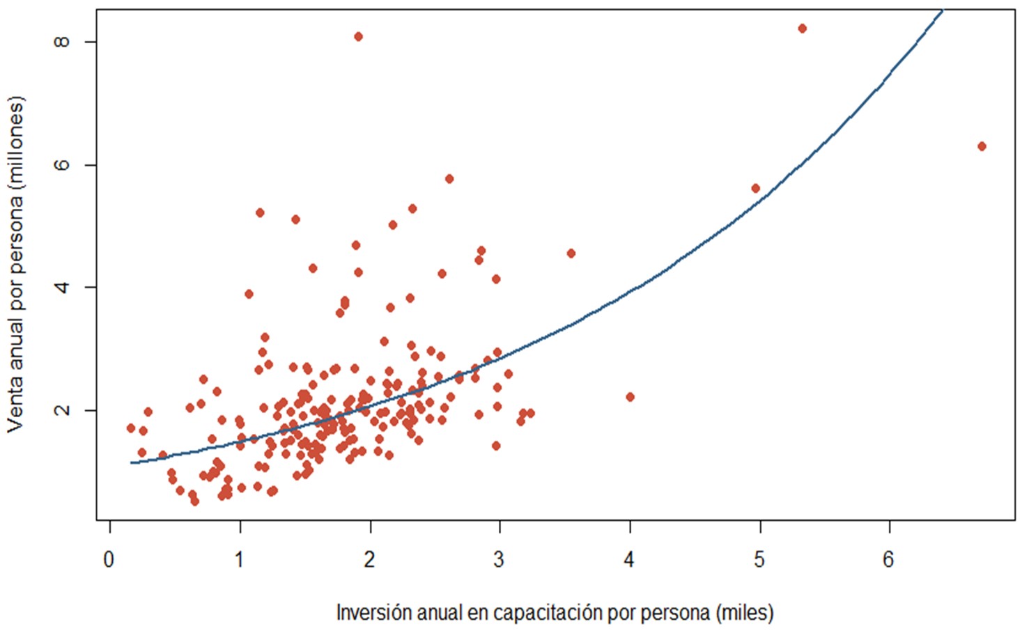 Por otra parte, del 41.74 % de las empresas que capacitan, se identifica que la mayoría invierte en promedio $1,802 (n=181, u.o. = 14531) pesos anuales por persona, y únicamente el 10. 5 % de establecimientos desembolsan más de $2,638 (1 DS, n=22, u.o. = 1704) pesos anuales por persona. Al realizar los análisis de regresión pertinentes, se encuentra que el comportamiento asociado a los sueldos es polinomial de grado dos mientras que el de las ventas es exponencial, lo que implica, para los sueldos, que un trabajador promedio alcanzará su salario anual máximo cuando se invierta en él (capacitación) la cantidad de $ 6, 618 pesos anuales, esto quiere decir, de acuerdo a los resultados obtenidos, que en las PyMES en México, un trabajador promedio podría incrementar mínimo 50 % su salario actual si se invirtiera más en capacitar al capital humano. De igual o mayor importancia es el efecto que tiene la capacitación en las ventas, que, como se mencionó anteriormente, su comportamiento es exponencial, esto es, desde el punto de vista organizacional, si se desea que las ventas anuales incrementen exponencialmente, la cantidad mínimo que se tendrá que destinar a capacitación debe ser de $4,200 pesos anuales.