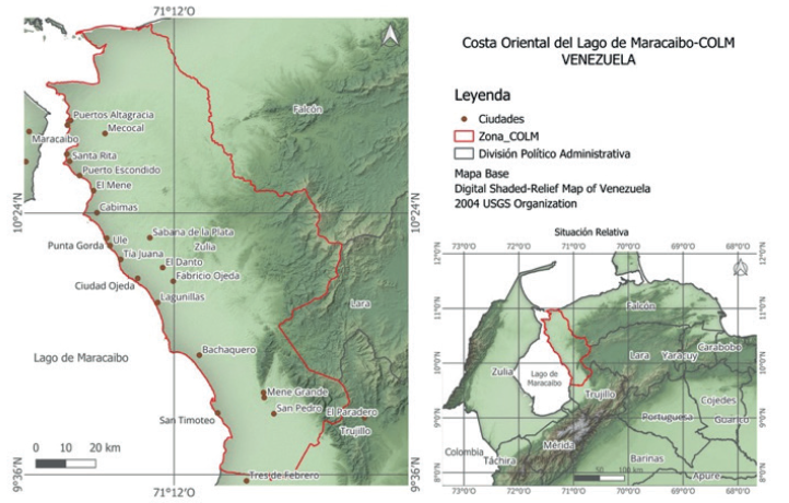 La COLM es una subregión administrativa del estado Zulia, localizada en la región occidental del país; limitando al oeste con el Lago de Maracaibo, al este con los estados Falcón y Lara, al norte con el Golfo de Venezuela y al Sur con el estado Trujillo. En la Figura 1, podemos observar el área seleccionada y los estados límites. Es una zona de producción petrolera, siendo hasta 1980 el centro de producción de hidrocarburos para Venezuela.