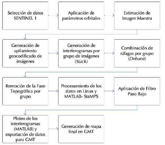 Se trabajó con la técnica avanzada de procesamiento DInSAR-PSI, siendo la más recomendada por diversos especialistas (Ferretti et al., 2007; Hanssen, 2015; Seppi, 2016) para el estudio de subsidencia en áreas urbanas. Por lo cual, se utilizaron 20 imágenes SENTINEL 1 en modo ascendente, con base en la metodología propuesta por Hooper (2018). A continuación, el flujograma adoptado para tal fin (Figura 3).