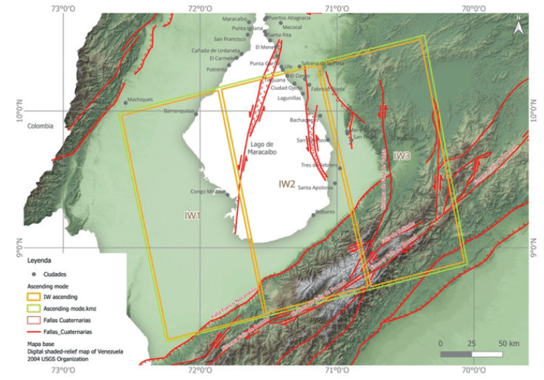 Para la zona de la COLM, Costa Oriental del Lago de Maracaibo, se utilizó la cantidad mínima de imágenes recomendada por Ferretti et al. (2007), 20 imágenes SENTINEL 1. Las mismas se descargaron, igualmente, de la plataforma ASF Data Search Vertex, en modo ascendente (Figura 4).