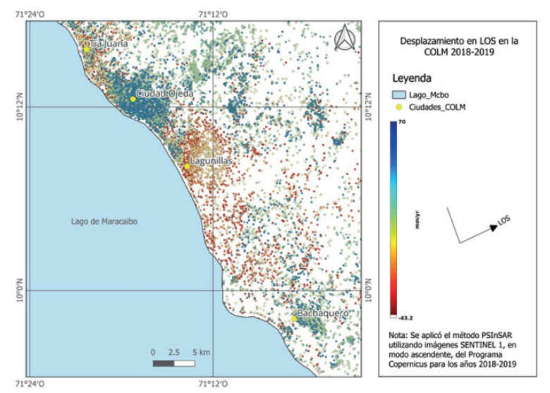 Las tasas estimadas de desplazamiento encontradas en COLM, arrojaron un proceso de descenso de la corteza (subsidence) de -40 mm en la zona de Lagunillas. Por el contrario, en Ciudad Ojeda se evidencia un proceso de levantamiento (uplift) de 45 mm a-1, Tia Juana con 35 mm a-1 y, Bachaquero con zonas que se levantan hacia el centro de la ciudad con 30 mm a-1 y zonas que se hunden hacia el NO con -20 mm a-1. Igualmente se destaca una zona de hundimiento entre las ciudades de Lagunillas y Bachaquero; pudiéndose inferir que se ha generado una compactación del suelo, lo que podría haber producido la contención de la subsidencia en algunas zonas y levantamiento del suelo en otras, según Arenas (2019).